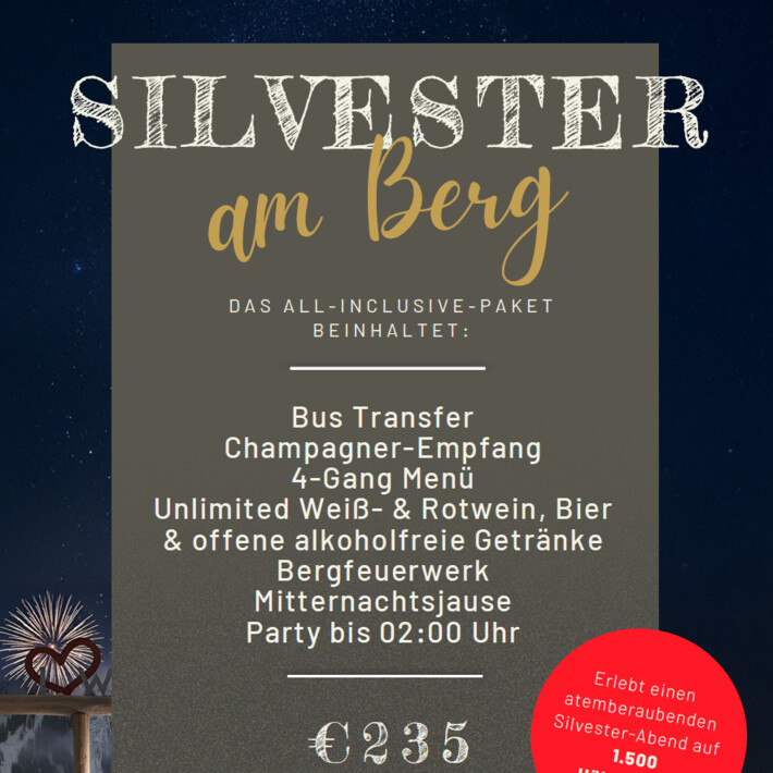 Ein besonderes Highlight ist das Berggipfel-Feuerwerk um Mitternacht mit atemberaubendem Blick ins Glemmtal. Für Dinner und Feier sind feste Sitzplätze vorgesehen, sodass jeder Gast den gesamten Abend über entspannt genießen kann.