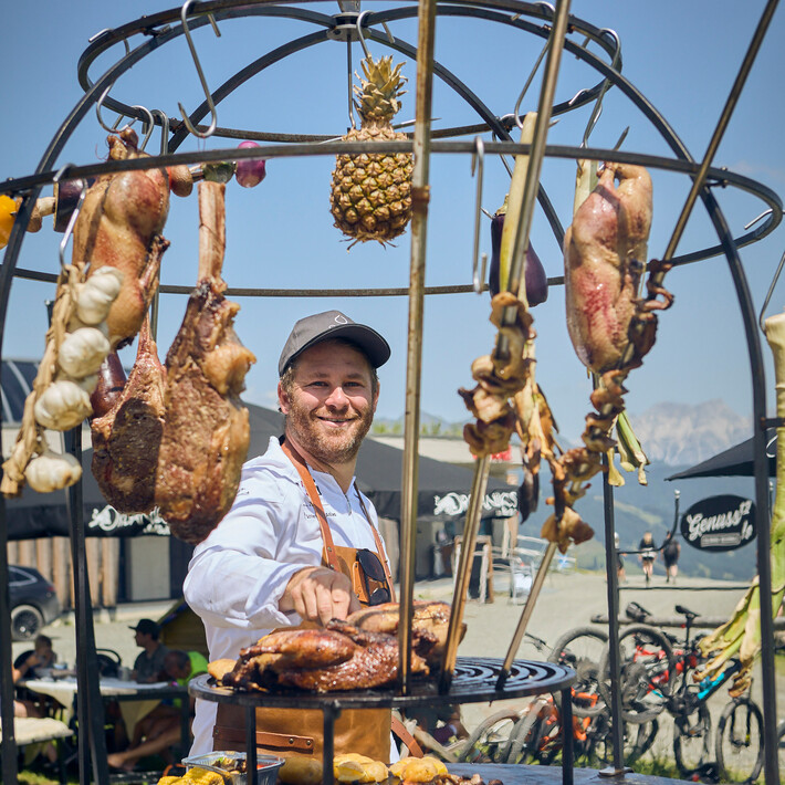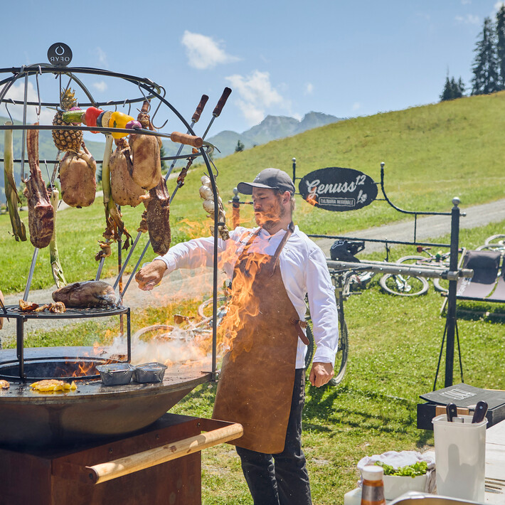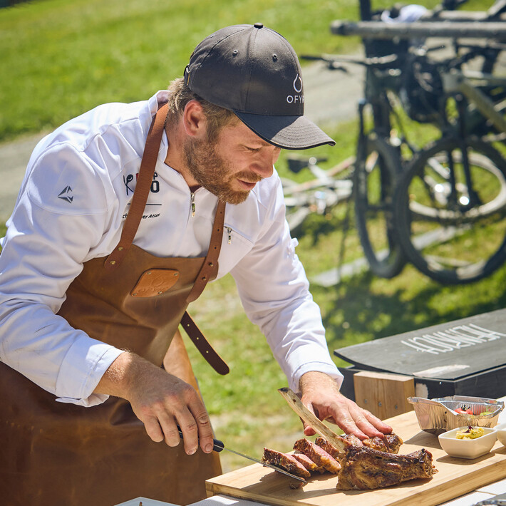 Genießen Sie unsere kulinarischen Köstlichkeiten von Haubenkoch Stefan Birnbacher, erfrischende Drinks und eine entspannte Atmosphäre auf unserer Terrasse mit atemberaubendem Blick auf die Berge.