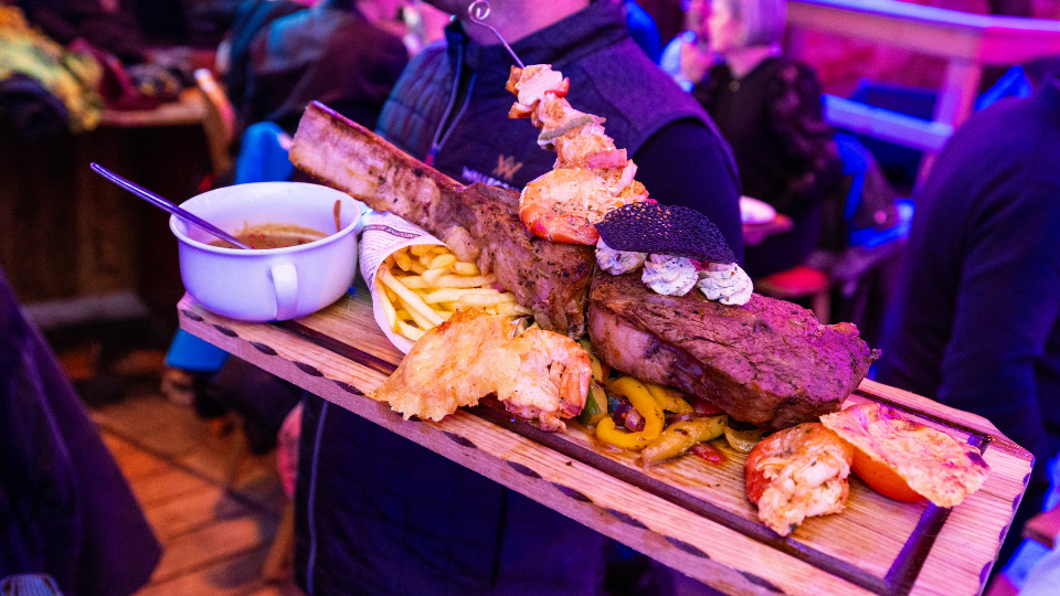 Unsere Tomahawk Steak Nacht am Berg vereint Kulinarik, Stimmung und Bergromantik. Auf der Alm erwartet euch ein exklusives 3-Gänge-Menü: eine cremige Suppe zum Start, zartes Tomahawk-Steak mit feinen Beilagen und zum Abschluss unser hausgemachter Kaiserschmarrn. Dazu servieren wir erlesene Rot- und Weißweine von Top Winzern.