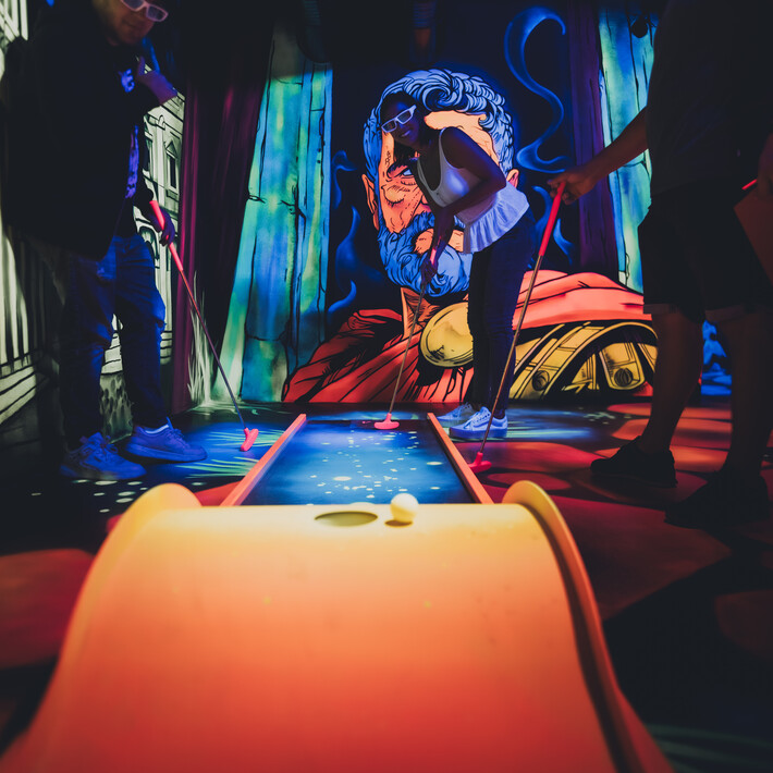Das Black Light Minigolf entführt Spieler auf eine Reise durch verschiedene Epochen der Menschheitsgeschichte – von Unterwasserwelten und Dinosauriern über Piratenabenteuer bis hin zur modernen Robotik. Lebendige Neonfarben und 3D-Brillen schaffen eine visuell beeindruckende Umgebung und ein fesselndes Spielerlebnis, das Realität und Fantasie verschmelzen lässt. Jede Bahn vermittelt Wissen über die Epochen und bietet neben Spaß und Unterhaltung auch Bildungsaspekte, wodurch das Black Light Minigolf eine unvergessliche Erfahrung für alle Altersgruppen schafft.