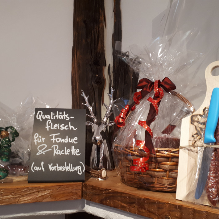 Auf telefonische Vorbestellung erhalten Sie bestes Qualitätsfleisch, wie Rinderfiletsteak, Hühnerfilet, Kalbsschnitzel, Spareribs, ein Sortiment für Fondue oder Raclette und vieles mehr an Köstlichkeiten.