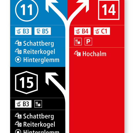 Die Spezialisten arbeiteten das neue System wie ein Verkehrsleitsystem aus, bei dem man die Informationen auf das Wesentliche reduzierte. Christian Lunger erklärt: „Jeder Wintersportler muss im Vorbeifahren – egal, wie schnell er unterwegs ist – erkennen können, was auf dem Schild zu lesen ist. In diesem Sinne der Reduktion wurde auch von Branding abgesehen. Eine wesentliche Änderung betrifft die Einführung von Pistennummern nach internationalem Vorbild. Das große und sehr komplexe Gebiet des Skicircus haben wir nun in Zonen mit Namen, wie sie bereits umgangssprachlich geläufig sind (etwa Schattberg wird Zone A, Zwölferkogel Zone B…) aufgeteilt. So funktioniert das System auch mündlich. In Kombination mit einer Zahl weiß man immer genau, wo man sich gerade befindet. Die Schilder geben nun auch die Verbindungspisten an – ähnlich Autobahnschildern, die neben dem Endziel auch dazwischen befindliche Ausfahrten mit jeweiligen Distanzen angeben. Auch die Positionen der Schilder wurden mit einem frischen Blick von außen neu gewählt.“