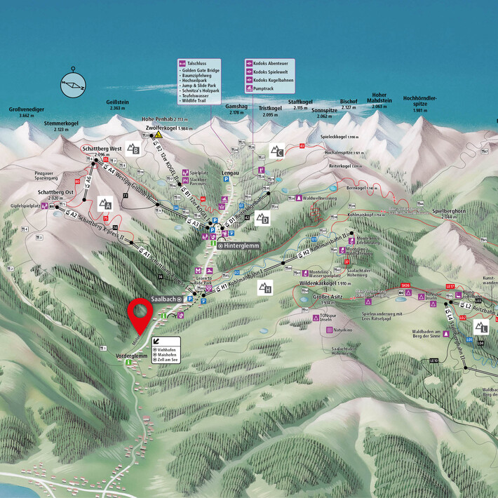 Der Motorikweg verläuft entlang der Saalachpromenade zwischen Jausern und Saalbach. An insgesamt 24 Stationen werden Geschicklichkeit, Gleichgewicht und Fitness trainiert.