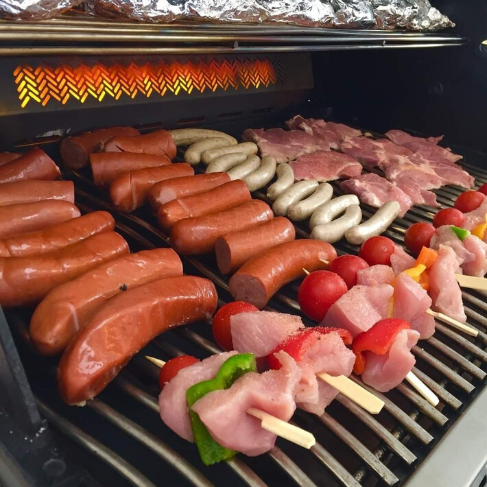 The buffet includes four courses: soup, crisp salads from the buffet, and, of course, the barbecue buffet (from meat to sausages to fish, and side dishes and sauces), and we finish with dessert.