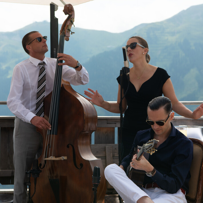 In summer, the cool JAZZ'N`SWING Brunch takes place in all weathers on the Reiteralm with live music.