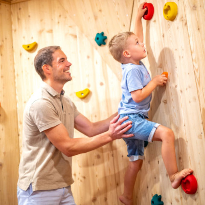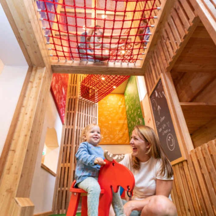 The 120m² indoor climbing and play paradise makes children's hearts beat faster. In three separate rooms, the little ones can let off steam to their heart's content. There are 2 climbing towers with 2 floors, 1 suspension bridge and connecting tunnel. A climbing wall with handholds and a toddler play area with wall games and a play kitchen.