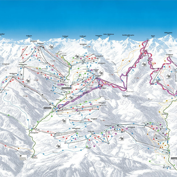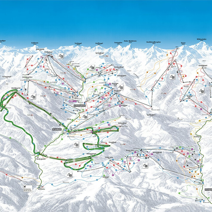 Route: A1+A2 Schattberg X-press, slopes 3 & 2a, I1+I2 Schönleitenbahn, slope 162, I4 Polten 8er, slope 222, L6 Muldenbahn 8er, slopes 215, 212 & 211, L3+L4 Steinbergbahn, slope 212, L5 Asitzgipfelbahn 8er, slope 218, L7 Sportbahn 6er, slopes 222 & 164, I3 Schönleiten 6er, slope 166, H4 Panorama 6er, slopes 160 & 153a, G1 Bernkogelbahn, slope 146, G2 Bernkogel 6er, slope 148, D6 Reiter-Ost 6er, slopes 87 & 125, E5 TirolS, E4 Reckmoos Süd, slope 121, E1 Reckmoos Nord, slope 109, F8 Maiskopflift, slope 105, F1 Streuböden, F2 Lärchfilzkogel, slope 110, E1+E2 Reckmoos Nord, slope 122a, E3 Hochhörndl 4er, slopes 122, 123 & 124, E6 TirolS, slopes 80, 81 & 82, D2 Hasenauer 8er, slopes 73 & 58, C2 Spieleck 6er, slopes 52, 51 & 50a, B4 12er NORD, slopes 30 & 31a, B5 Zehner 6er, slopes 31, 30 & 37, A3+A4 Westgipfelbahn, slopes 7 & 4, A5 Limberg 8er, slopes 1, 1b & 1a
