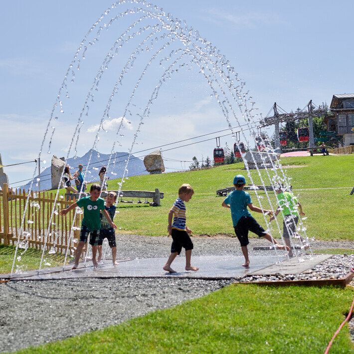 Start through the fountain into water fun for the whole family! Follow the course of the water past a mill wheel and water barriers to the leaf pond. Dare the balancing act as you cross the pond and then tame the water with drawbars. Finally, you can set off for new shores with two ferries. When designing Timok's water games, Bergbahnen Fieberbrunn picked up on a regional theme and incorporated the three Fieberbrunn rivers Rotache, Weißache and Schwarzache using different coloured stones.