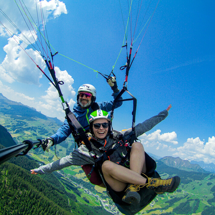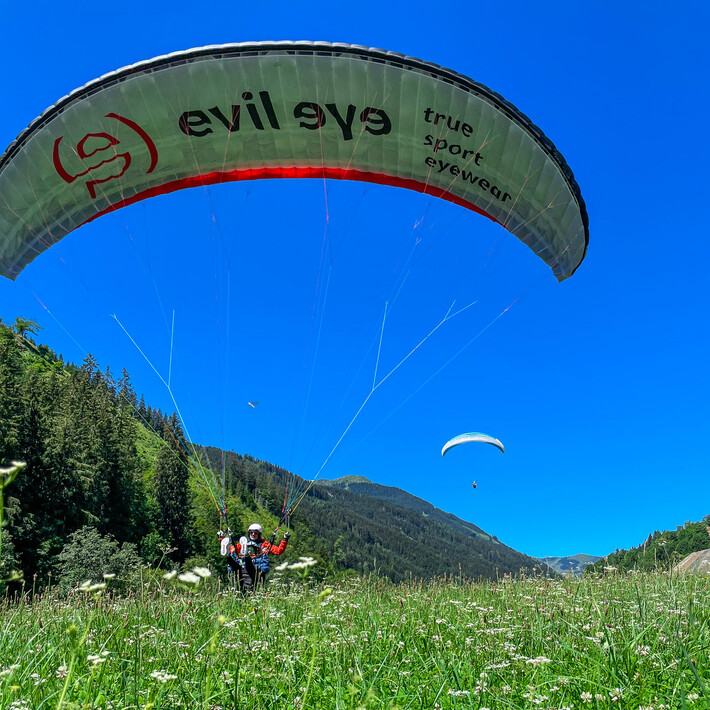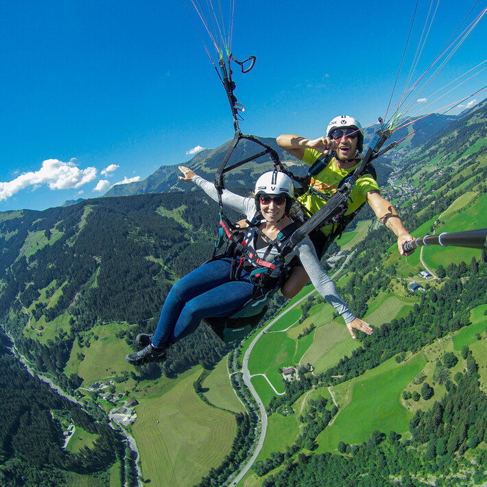 You can take off to Glemm Area and leave the daily routine behind. A rewarding and unforgettable view is waiting during a tandem paragliding flight. After arriving at the flying, the final preparations follow. We open the paragliding umbrella, adjust the harness and discuss start-up procedures. After some starting exercises and a final check by our qualified tandem pilot, it’s time to take off. You start running and watch as the ground disappears under your feet. Weightless and calm, you’ll glide over the valley. A unique feeling that only a paragliding flight can offer.