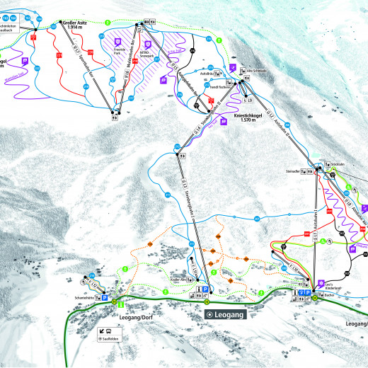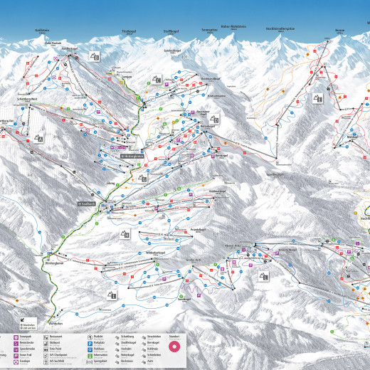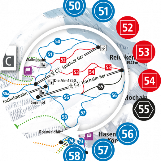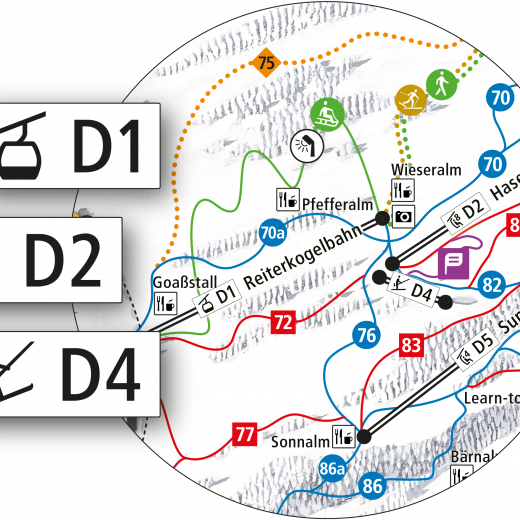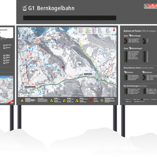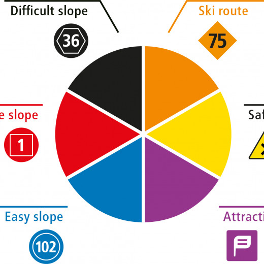 Straightforward pictograms (lift type) and alphanumeric codes (zone/detailed zone) enable clear labelling of the lifts and ski area zones. The slopes are (like the zones) numbered in a clockwise manner and are therefore easy to distinguish on the panoramas and maps.